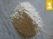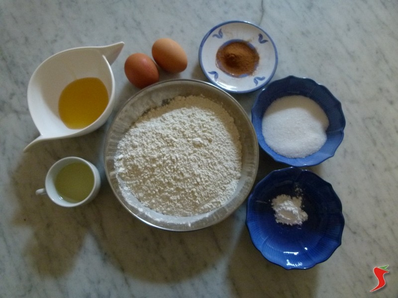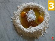 Iniziare la preparazione dell’impasto disponendo la farina su di una superficie piana (1) e conferirle la classica forma di fontanella (2). In seguito, riporre al centro di questa, tutti gli ingredienti necessari alla preparazione, ovvero: cannella, zucchero a velo, olio di semi di lino, lievito, miele e uova (3).