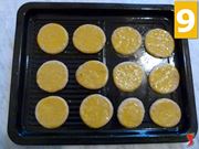 Dopo aver cosparso la superficie su cu lavorare nuovamente l’impasto con la farina, prendere un mattarello e iniziare a stendere la pasta rendendola molto sottile (7). In seguito, con l’aiuto delle formine, conferire ai biscotti la forma che più desiderate, in questo caso si è optato per una semplice forma rotonda, possibile da realizzare anche con i bicchieri (8). Infine, prendete una pirofila, da ungere con dell’olio di semi di girasole e riponete al suo interno i biscotti da infornare, sulla cui superficie dovrete spennellare il tuorlo di un uovo. Ultimata tutta la preparazione, sarà possibile infornare i dolcetti per circa 30 minuti a 180°C.