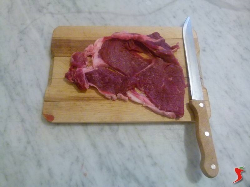 Mentre il condimento è in cottura, battere la carne da entrambe i lati con un coltello dalla parte della lama, in questo modo la carne risulterà sfilettata.