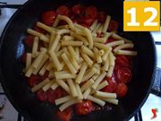 Il sugo per la cottura necessita di circa dieci minuti (10), al termine si potrà spegnere la fiamma e attendere che la pasta sia pronta (11). Appena sarà possibile, aggiungere la pasta all’interno della padella (12).