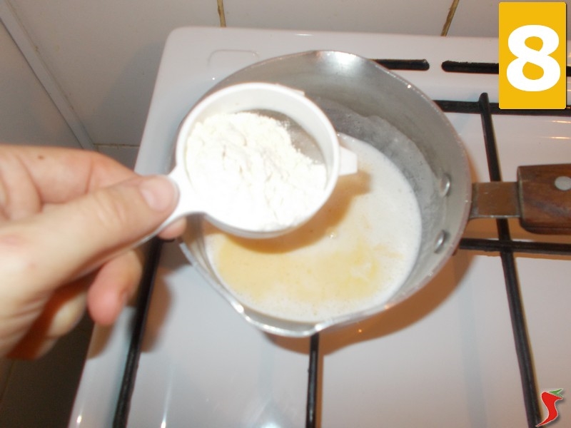Ora aggiungete al latte in ebollizione le uova con lo zucchero lavorate precedentemente (7) ed incorporatevi la farina aiutandovi con un setaccio (8) per evitare che si formino grumi nel composto. Mescolate accuratamente con un mestolo di legno e quando la crema si sarà ristretta a sufficienza, aggiungete la scorzetta di limone (9). Continuate a mescolare a fuoco spento.