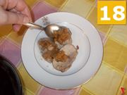Fate cuocere l'arrosto per circa 40 minuti in totale. Una volta pronto, con un forchettone estraete l'arrosto dalla casseruola e ponetelo sopra un tagliere, togliete la retina, e proseguite affettandolo non troppo finemente (16) ed una volta terminato questo passaggio, impiattate le fette di vitello (17). Proseguite aggiungendovi sopra con un cucchiaio il composto di mele (18). Servite in tavola la pietanza ben calda, accompagnandola con del buon vino rosso dai sapori fruttati.