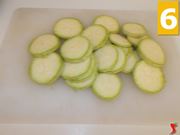 Ripete la stessa operazione con la zucchina, lavatela sotto abbondante acqua corrente (4), successivamente ponetela sopra un tagliere, ed affettatela a rondelle non troppo sottili (5). Una volta concluso anche questo passaggio, lasciate da parte dentro un piatto fondo da portata (6).