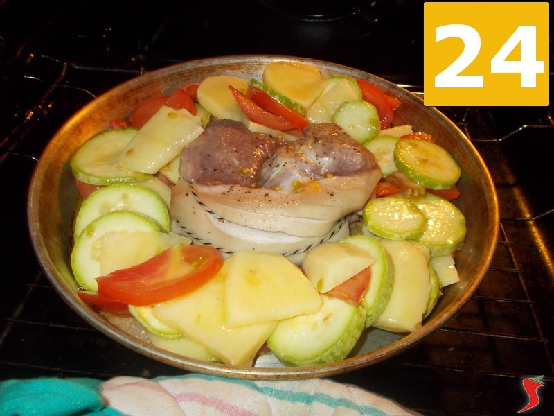 Estraete la teglia dal forno (22), e con un cucchiaio, aggiungete vicino alla carne di maiale, le verdure precedentemente condite (23). Infornate nuovamente e lasciate cuocere per altri trenta minuti a 150, girando almeno due volte la carne e e verdure. Una volta ben cotta la vostra ricetta, togliete la teglia dal forno (24), ed impiattate. Servite in tavola la ricetta con del buon vino rosso dai sapori fruttati.
