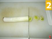 Iniziate la ricetta ponendo il porro sopra un tagliere (1) dopodiché con un coltello dalla lama seghettata tagliuzzatelo a rondelle (2). Una volta terminata questa operazione, con le mani aprite le rondelle e lasciate da parte l'ortaggio dentro un contenitore o un piattino (3).