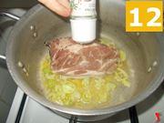 Fate sciogliere il burro e rosolare gli altri ingredienti a fiamma moderata per circa due minuti (10), poi aggiungetevi la carne di maiale (11) ed aggiustate di sale fino a vostro gradimento (12).