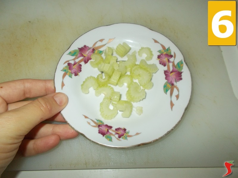 Ora prendete la costa di sedano e lavatela accuratamente sotto abbondante acqua corrente (4), una volta pulita, ponetela sopra un tagliere e con un coltello dalla lama seghettata, iniziate a tagliuzzarlo non troppo spesso (5). Una volta terminato il passaggio, lasciate da parte l'ortaggio sopra un piattino (6).