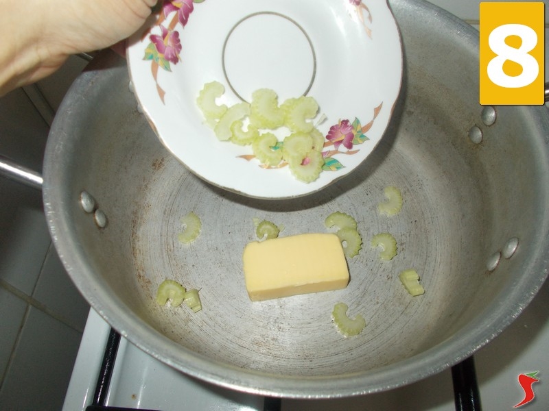 Prendete una casseruola di grandi dimensioni, ed aggiungetevi al suo interno il burro a temperatura ambiente che avete a disposizione (7) dopo unitevi il sedano precedentemente lavorato (8) ed infine il porro a rondelle (9).