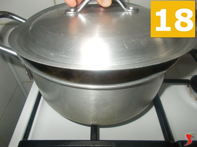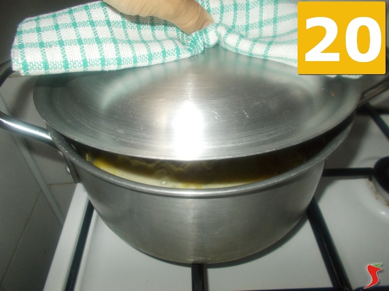 Una volta trascorsa la prima mezz'ora, unite nella casseruola lo spicchio di aglio precedentemente sbucciato (19), e coprite nuovamente con il coperchio (20). Lasciate cuocere fino a quando non si sarà assorbito gran parte del latte aggiunto in precedenza, dopodiché, sempre aiutandovi con un bicchiere, aggiungetene dell'altro (21). Coprite nuovamente e lasciate cuocere per altri trenta minuti.