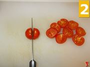 Iniziate la ricetta a partire dai pomodorini pachino che dovrete lavare con massima cura (1) sotto l'acqua corrente. Quindi metteteli sul tagliere e con il coltello seghettato iniziate a tagliarli (2) a metà. Utilizzate il coltello seghettato in quanto la lama liscia perde l'affilatura a causa dell'acidità del pomodoro. Quindi mettete tutto a parte (3) in un piattino.