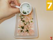 Poi spolverate i gamberetti con il prezzemolo tritato (7) fresco e poi iniziate a disporre le metà dei pomodorini (8) sopra i gamberetti, allineandoli con cura con la parte tagliata rivolta verso il basso. Infine con un cucchiaio, spolverate la pirofila con il pangrattato (9), distribuendolo uniformemente.