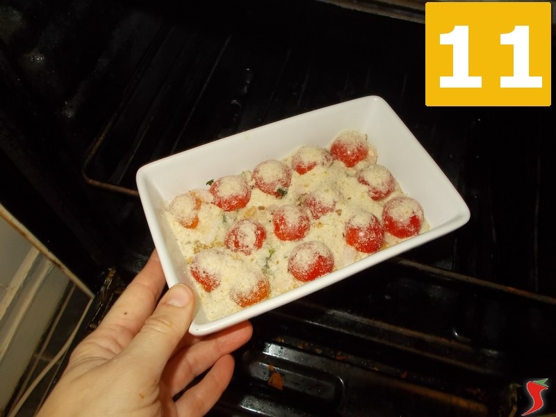 Una volta spolverato bene con il pangrattato (10), non vi resta che infornare (11) la pirofila in forno preriscaldato a 160°C per circa 20 minuti. Una volta pronti sfornateli (12) e serviteli subito in tavola ancora caldi o fateli riposare prima di consumarli, mettendo a tavola anche il macinino del pepe nero per chi volesse servirsene.