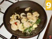 Ora mettete i gamberetti in un colino e lavateli bene (7) sotto l'acqua corrente e quindi scolateli bene per aggiungerli nella padella (8) una volta soffritta la cipolla. Fateli cuocere in padella per circa dieci minuti al massimo (9) girandoli spesso.