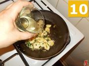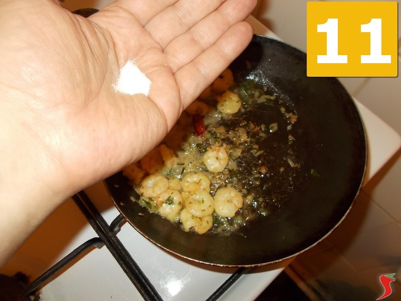 Dopo circa cinque minuti di cottura aggiungete il vino (10) a sfumare e alzate la fiamma per poi aggiungere un pizzico di sale (11). Quando avete terminato la cottura togliete l'aglio (12) e spegnete il fuoco per far raffreddare i gamberetti.