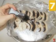 Ora prendete una teglia rotonda di grandi dimensioni e foderate la base con la carta argentata (4), dopo ponete al suo interno i funghi lavorati nel passaggio iniziale di questa ricetta (5) ed aggiustate di sale fino a vostro gradimento (6).