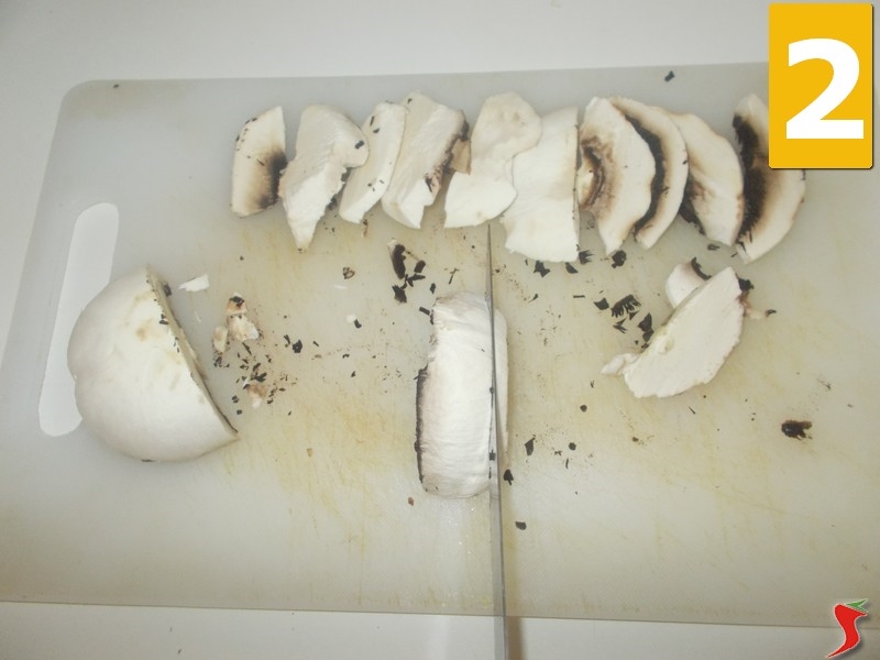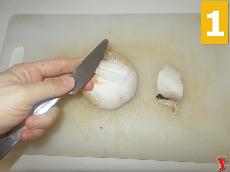 Iniziate la ricetta ponendo i funghi sopra un tagliere e proseguite eliminando la pelle aiutandovi con un coltello dalla punta arrotondata, partendo dalla parte interiore del fungo (1), una volta puliti tutti i funghi a vostra disposizione, con un coltello dalla lama lunga, iniziate a tagliuzzarli a fettine non troppo spesse (2) e terminato questo passaggio, lasciate da parte il composto lavorato sopra un piattino piano (3).