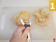 Iniziate questa ricetta ponendo l'ortaggio sopra un tagliere e con un pelapatate eliminate finemente tutta la buccia, ripetendo la stessa operazione per il resto dell'ortaggio che avete a vostra disposizione (1), una volta terminata questo passaggio, dividete in due parti le patate utilizzando un coltello dalla lama liscia e lunga (2), proseguite affettando finemente la patata (3). Lasciate da parte il composto sopra un piatto piano da portata.
