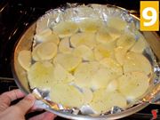 A questo punto foderate con la carta argentata il fondo di una teglia rotonda di medie dimensioni (4) ed iniziate a distribuirvi all'interno una parte delle patate che avete lavorato in precedenza (5), tanto da realizzare una sorta di letto. Proseguite aggiustando di sale fino a vostro gradimento le patate nella teglia (6).