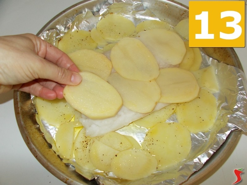 A questo punto ricoprite il filetti di merluzzo con il restante delle patate che avete messo da parte (13) ripetendo la stessa operazione su entrambi i filetti (14) e completata questa operazione, aggiustate di sale fino a vostro gradimento anche l'ortaggio (15).