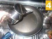 Ora versate cinque cucchiai di olio extravergine di oliva in una padella ampia (4) e accendete il fuoco a fiamma viva. Sbucciate l'aglio e mettetelo a soffriggere (5) nella padella e una volta appena dorato metteteci anche le cozze (6).