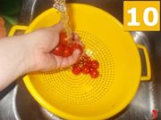 Nel frattempo che le cozze si cuociono, lavate bene (10) i pomodorini pachino sotto l'acqua corrente, e quindi tagliateli in due parti (11), per poi metterli da parte in un piattino (12).