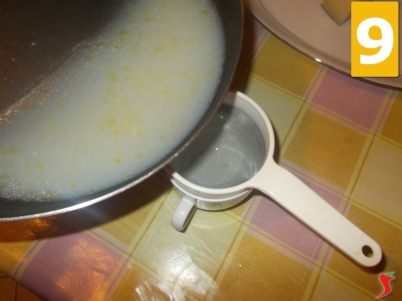 Quindi aggiungete un ciuffo di prezzemolo alle cozze (7) e coprite con un coperchio per qualche minuto, lasciando la fiamma viva, finché le cozze non si aprono del tutto. Quindi spegnete il fuoco, lasciate raffreddare qualche minuto, e quindi estraete i molluschi con un cucchiaino (8), gettando via i gusci. Mettete da parte tutti i molluschi e quindi filtrate l'acqua (9) di cottura delle cozze per metterla da parte.