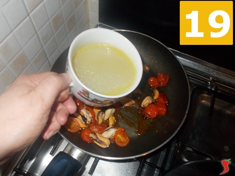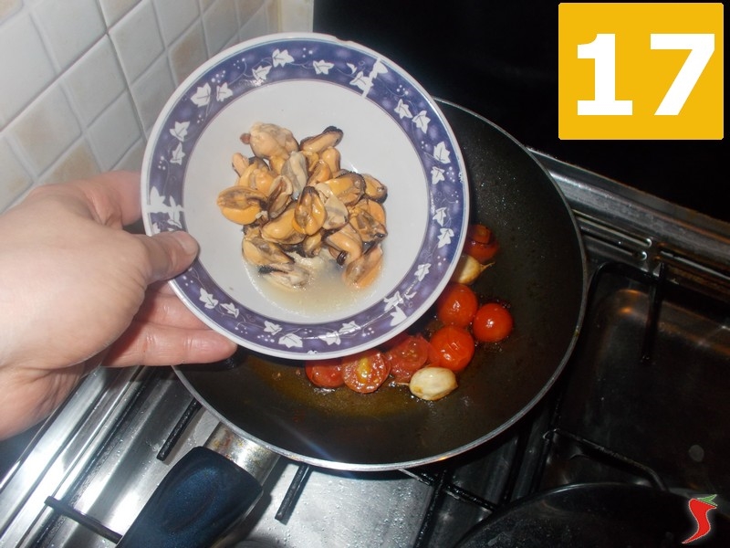 Quando l'aglio è dorato unite alla padella anche i pomodorini pachino (16), lasciateli soffriggere qualche minuto a fiamma bassa, e quindi unite anche le cozze sgusciate (17). Mescolate bene con un mestolo di legno (18) e lasciate andare la cottura a fiamma vivace.