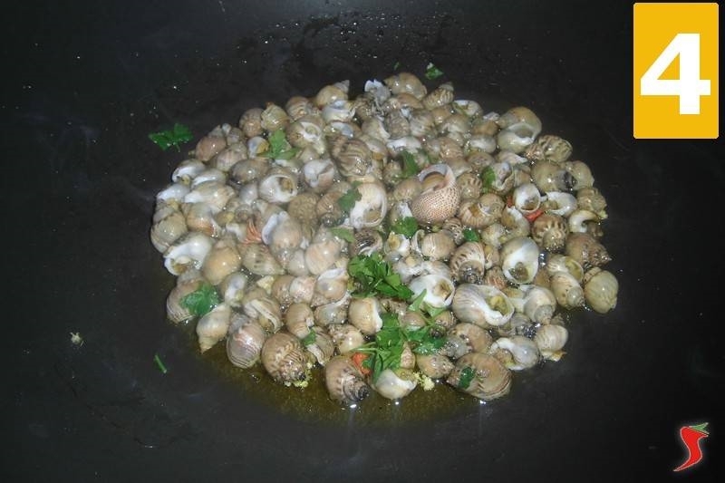 Come descritto nella prima parte per procedere alla preparazione delle lumache. Dopo averle lavate passandole per pochi secondi sotto l'acqua corrente, potete metterle in una pentola con un filo di acqua ed aspettare che fuoriescano. Bastano pochi minuti e poi spegnete il fuoco. Potete anche saltare questa fase se volete delle lumache di mare più dure. Mettete tre cucchiai di olio abbondante in una padella e schiacchiate uno spicchio di aglio (1), aggiungete il peperoncino (2) e lasciate riscaldare l'olio. Quando l'olio sarà caldo unite le lumache di mare (3) coprite con un coperchio e lasciate andare a fuoco medio per qualche minuto.