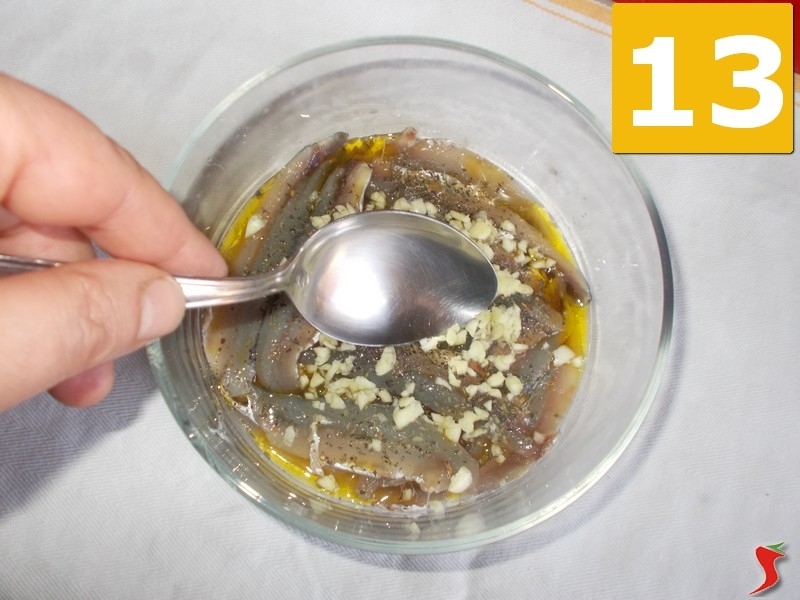 Infine mescolate sommariamente (13) con un cucchiaio e quindi riponete il contenitore con le acciughe in frigo (14), per farle marinare almeno un paio d'ore. Il consiglio è comunque quello di farle marinare molto i più, in modo che si aromatizzino bene prima di impiattarle (15) e servirle in tavola come aperitivo o antipasto.