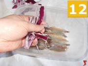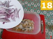 Infine mettete il contenitore in frigo (16) per far marinare le acciughe almeno un paio d'ore. Ricordate che più tempo marineranno, più buono sarà il risultato finale. Quando avranno marinato, toglietele singolarmente dal contenitore e rimettetele su della carta assorbente (17) per farle asciugare. Poi rimettetele in un contenitore pulito, stendendole bene, e metteteci sopra le fettine di cipolle (18) avanzate. Versate un filo di olio e lasciate da parte, per servire quando volete. Potrete conservarle in frigo per qualche giorno.