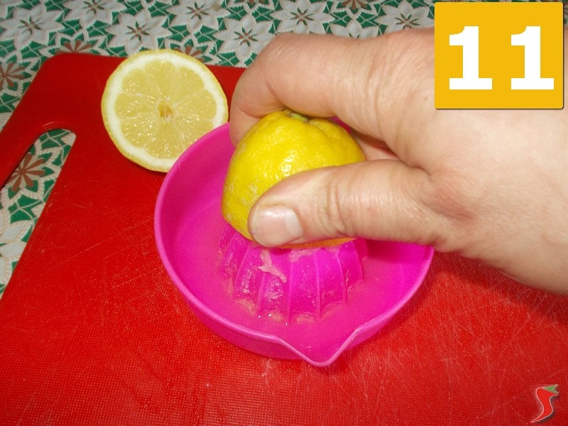 Poi prendete il limone, tagliatelo in due metà (10) sul tagliere e quindi spremetelo con lo spremiagrumi (11) e lasciate il succo a parte. Quindi prendete parte delle fettine di cipolle e distribuitele sullo strato di acciughe (12).