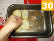 Ora prendete una teglia da forno ed ungetene (28) bene il fondo, prima di spolverarlo bene con il pan grattato aromatizzato (29) alle erbe. Quindi iniziate a stendere un letto di patate (30) sul fondo della teglia, coprendolo bene. Salate leggermente e proseguite la ricetta.