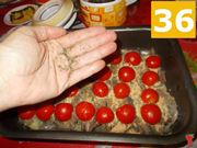 Ora spolverate di nuovo gli ingredienti nella teglia con il pan grattato aromatizzato (34) e quindi iniziate a fare uno strato con i pomodorini ciliegino (35), su cui poi spolvererete anche l'origano secco (36).