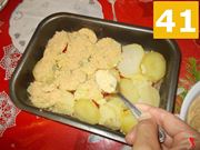 Ora non vi resta che bagnare il tutto con il brodo vegetale (40), e quindi spolverare ancora le patate con il pan grattato aromatizzato (41) rimasto. Prendete la teglia e infornatela (42) in forno preriscaldato a 170°C per circa 40 minuti. Una volta passato il tempo di cottura in forno, lasciate la teglia in forno e accendete il grill. Lasciate la teglia sotto al grill per cinque minuti, in modo da creare la crosticina superficiale con il pan grattato, e quindi sfornate, per far riposare la preparazione per circa un quarto d'ora. Quindi impiattate e servite in tavola, accompagnando con un buon vino bianco strutturato, dai gusti fruttati.