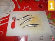 Iniziate la ricetta pulendo le acciughe, che vengono sempre vendute non pulite (1). Prendete ogni singola acciuga con le mani, e stringete la testa, all'altezza delle branchie, tra le dita (2), per poi tirarla via (3) in modo che si stacchi dalla spina portando con se anche le interiora. Pulite tutte le acciughe e proseguite