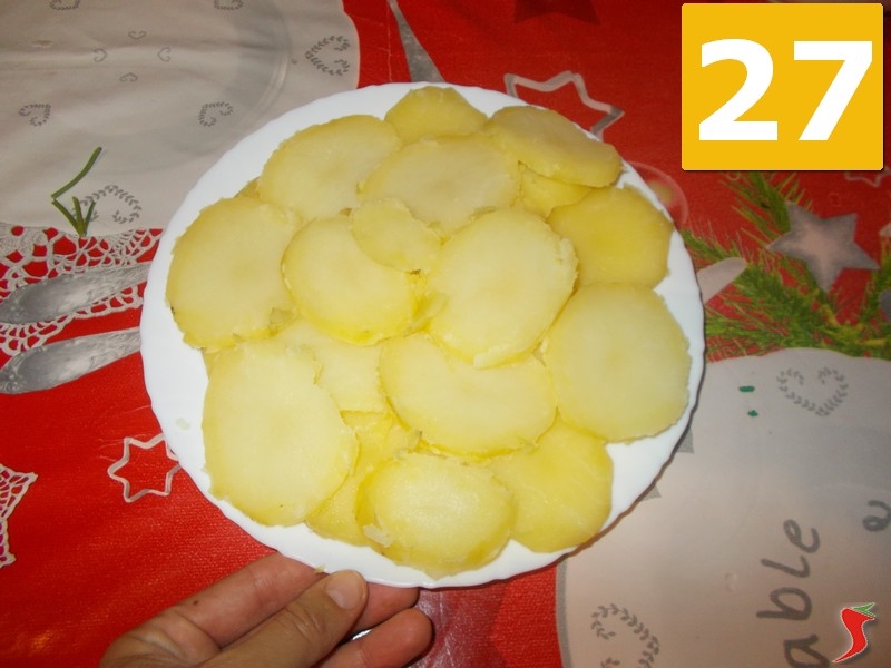 Ora riprendete le patate che si saranno già raffreddate, e iniziate a sbucciarle (25). Quindi mettetele sul tagliere ed iniziate ad affettarle (26) in fettine spesse 4 millimetri. Quindi mettetele su un piatto (27), ben separate.