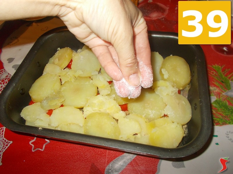 Ora prendete l'aceto di vino bianco e versatelo sugli ingredienti (37), e poi stendete l'ultimo strato di fettine di patate (38) sopra i pomodorini. Quindi salate leggermente (39) le patate e proseguite.