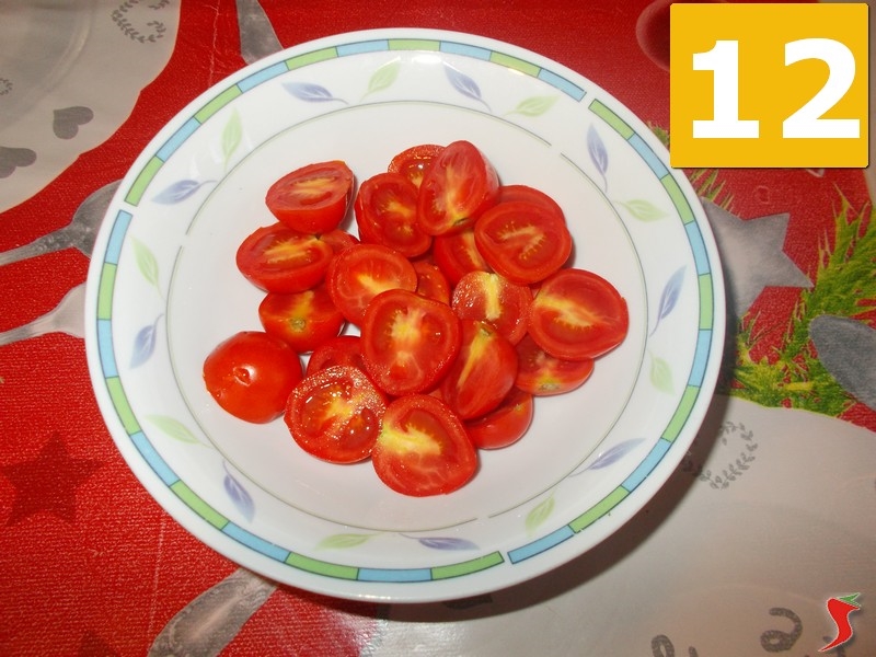 Quindi lavate bene i pomodorini ciliegino (10) sotto l'acqua corrente, e quindi asciugateli per metterle sul tagliere. Con il coltello a lama seghettata, per non rovinare l'affilatura della lama con l'acidità del pomodoro, tagliateli in due parti (11) e metteteli quindi in una ciotolina (12) a parte.