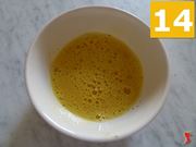 Dopo aver aggiunto sale e pepe alle uova rotte all’interno della ciotola (12), prendere una forchetta, con la quale andrete a battere le uova (13), fino al raggiungimento di una miscela omogenea (14).