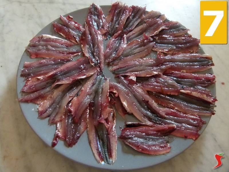 Successivamente, quando tutte le alici saranno state pulite da interiora e lisca, riporle tutte su di un piatto (7) e in seguito, ultimare la pulitura, sciacquarle sotto dell’acqua corrente fresca e riporle nuovamente in un piatto e lasciarle colare dell’acqua in eccesso (8).