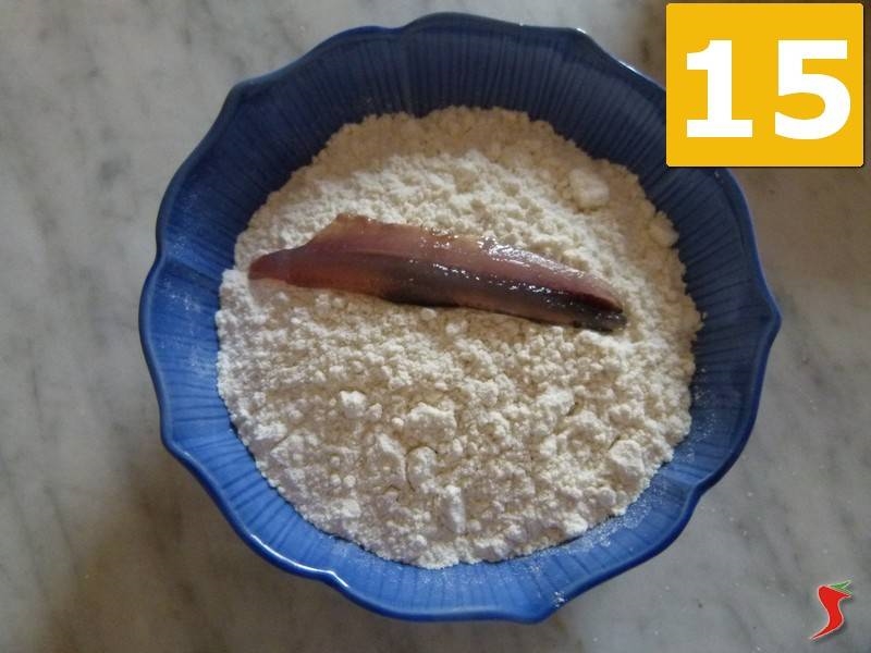Ora che le alici sono pulite e le uova sono state preparate, si può procedere con la preparazione ultima prima di intraprendere il processo della frittura. Quindi, riempire altre due ciotole, una con la farina e un’altra con il pane grattugiato. Seguendo un ordine ben preciso, immergere le alici prima nella farina(15), ricoprendo attentamente tutta la superficie del pesce (16). A seguire, inserire le alici infarinate all’interno della ciotola le uova e immergerle completamente ricoprendo, anche in questo caso, tutta la superficie delle alici (17).