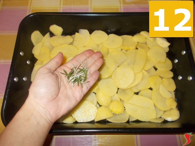 A questo punto, aggiungete nella teglia da forno le patate lavorate in precedenza (10) e spolverate di sale fino a vostro gradimento (11), aggiungete anche il rosmarino fresco (12) e mettete a cuocere in forno preriscaldato a 150 gradi per circa trenta minuti.