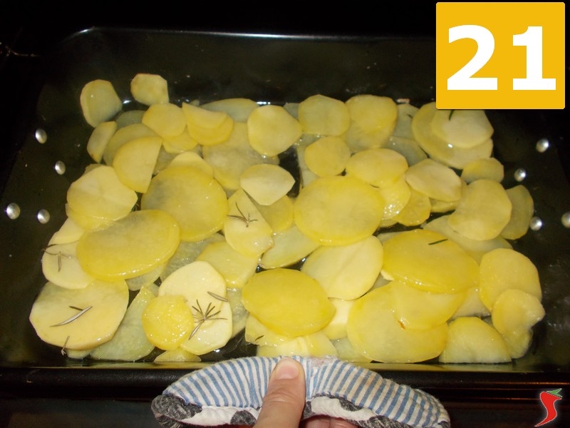 Ora aggiungete sopra il pesce il pepe macinato fresco (19) e nel frattempo, girate le patate nella teglia con una ramina (20), ed infornate nuovamente per altri dieci minuti (21).