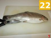 Ora prendete il pesce e iniziate ad eviscerarlo. Con la lama della forbice, togliete tutte le squame, sciacquate, e poi, sempre con le forbici, aprite la pancia (22), tagliando dall'orifizio fino alle gola del pesce. Togliete tutte le interiora con le mani (23), e anche le branchie (24).