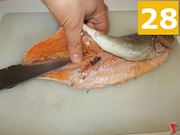 Iniziate a sfilettare il pesce, proseguendo il taglia del primo filetto con la lama parallela alla colonna vertebrale (28), per staccare la carne e dividere la trota in due. Poi, con le forbici, staccate la testa (29), lasciando intatta la spina e poi staccate il primo filetto (30), tagliando con il coltello la pelle e la carne nella parte rimasta attaccata.