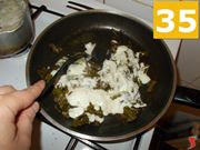 Ora che la besciamella è raffreddata, versatela sui broccoletti (34), e mescolate con cura (35) per unire gli ingredienti. Quindi prendete una teglia da forno, bagnatela con dell'acqua e stendeteci sopra un foglio di carta da forno (36). L'acqua la farà aderire alla teglia, per lavorare meglio.