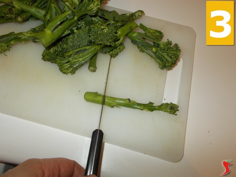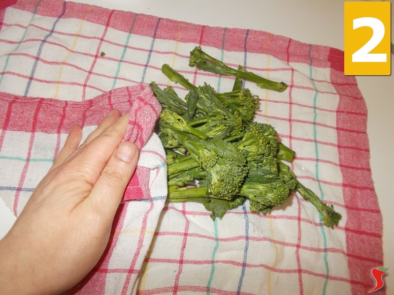 Iniziate lavando bene i broccoletti (1) per poi asciugarli in un panno pulito (2) e metterli sul tagliere. Tagliate via la parte finale dei gambi (3), quella più dura.