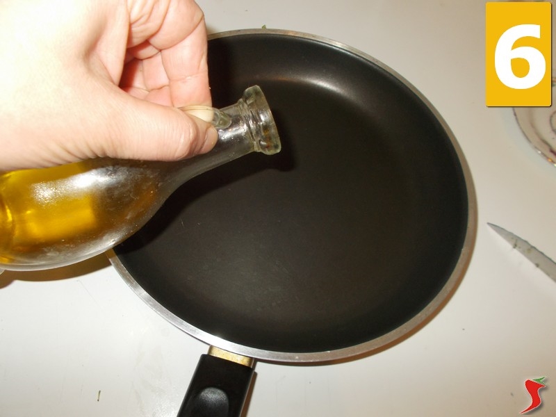 Quindi tagliate i broccoletti in piccoli pezzi (4) e metteteli da parte in un piatto (5), mentre verserete sei cucchiai di olio extravergine di oliva (6) in una padella grande, per farli scaldare a fiamma media.