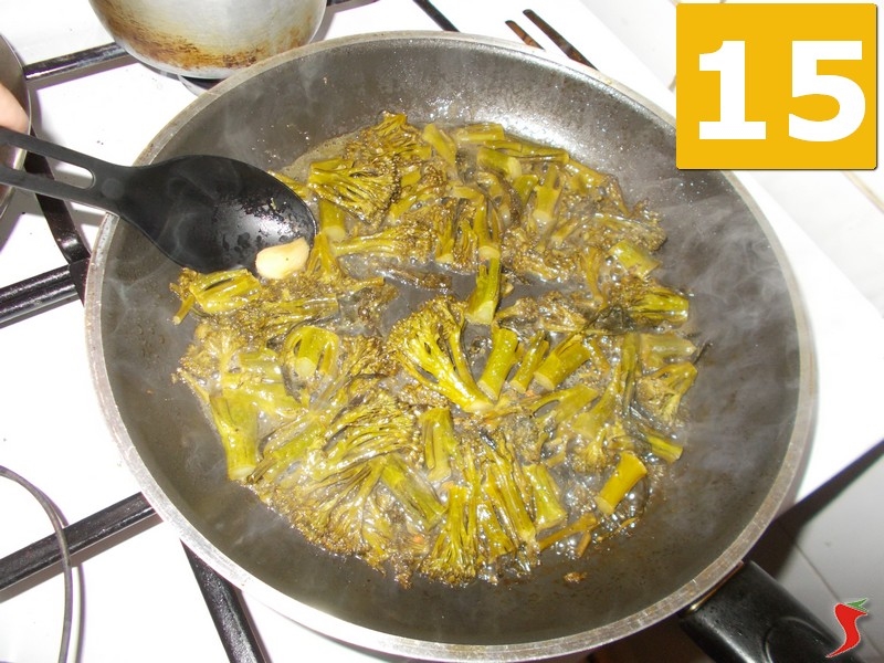 Quindi coprite la padella con il coperchio (13) e abbassate la fiamma al minimo, per far cuocere per circa 20 minuti. Infine, aggiustate con poco sale (14), ed eliminate l'aglio (15). Lasciate cuocere altri cinque minuti, per eliminare il sughetto di fondo, e poi spegnete il fuoco.