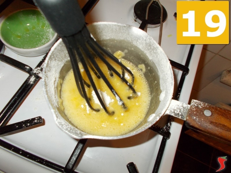 Poi mettetevi a preparare la besciamella. Riscaldate il latte in un pentolino e metteteci poi la noce moscata (16), mescolandola bene. Quindi mettete il burro in una pentola e accendete il fuoco con la fiamma al minimo, per farlo sciogliere (17) finché non è tutto fuso. A questo punto, con un setaccio, per non formare grumi, mettete la farina (18) sul burro. Aggiungete un pizzico di sale e proseguite.